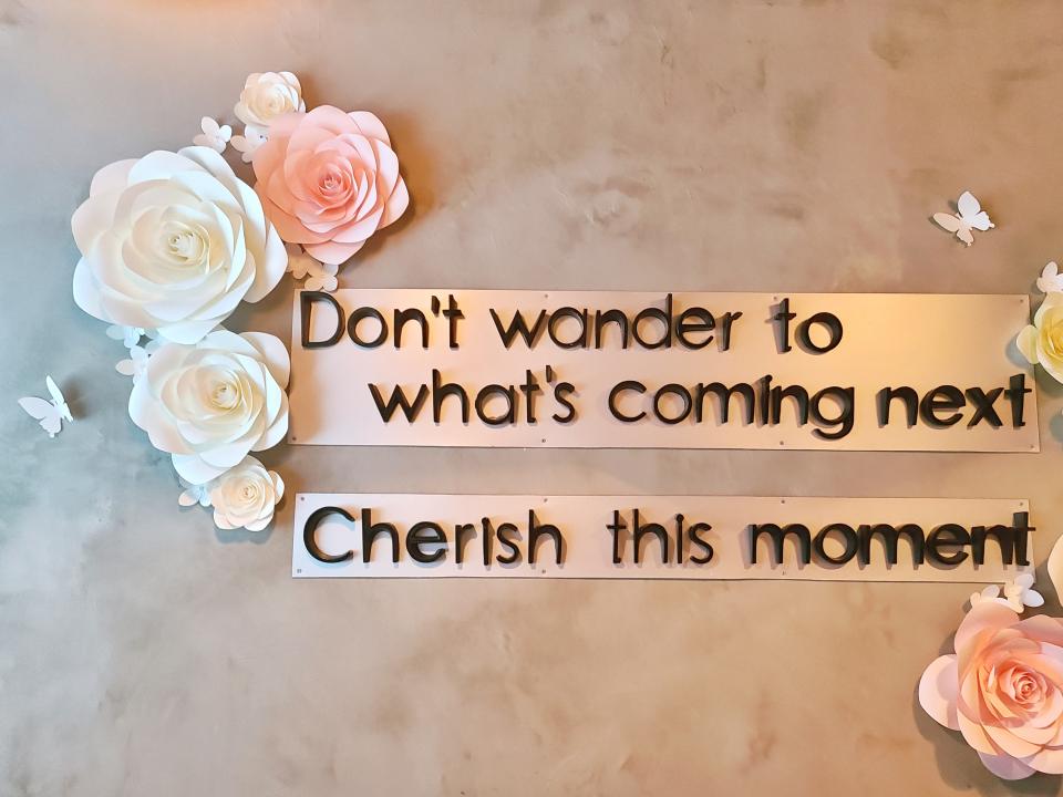 其中一面牆掛著"Don't wonder to what's coming next, cherish this moment"的字句