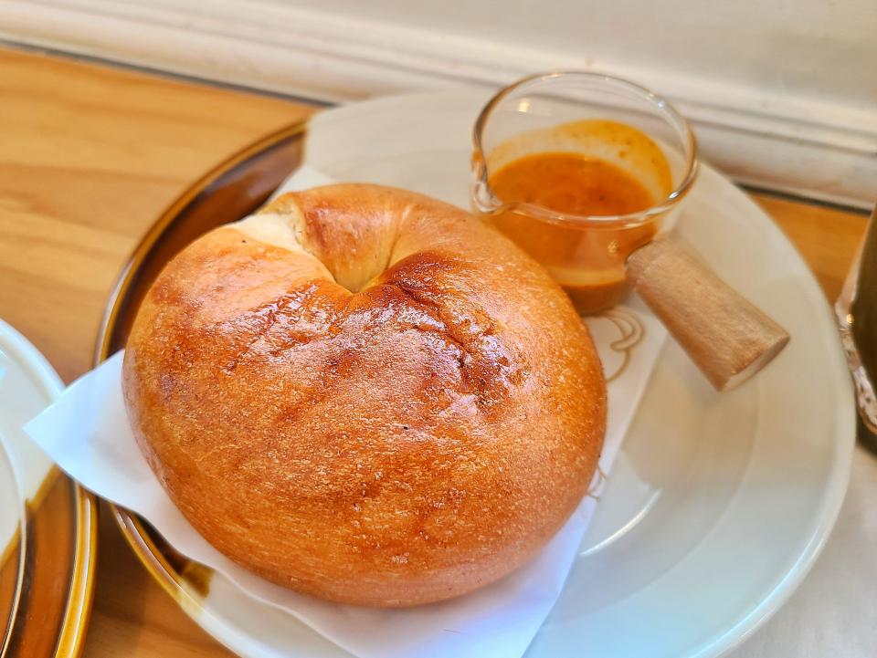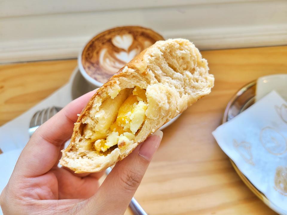 這款Bagel裡面加了cream cheese和很多芒果肉,料超足之餘幾乎每一口都能吃到酸甜的芒果😍 沾上茶濃帶香有些香草味的泰茶醬,竟然意外地很match😋😋 個人大推這個!